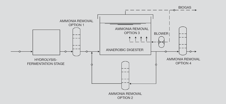 Figures vary, but as ammonium ion concentrations increase in an anaerobic digester, typically above 1,000 mg/L, performance, in terms of biogas production, drops off. Anaerobic digestion is fully inhibited at around 5,000 mg/L. It is, therefore, an essential requirement to manage ammonia concentrations, a requirement for which there exists a wide range of options.