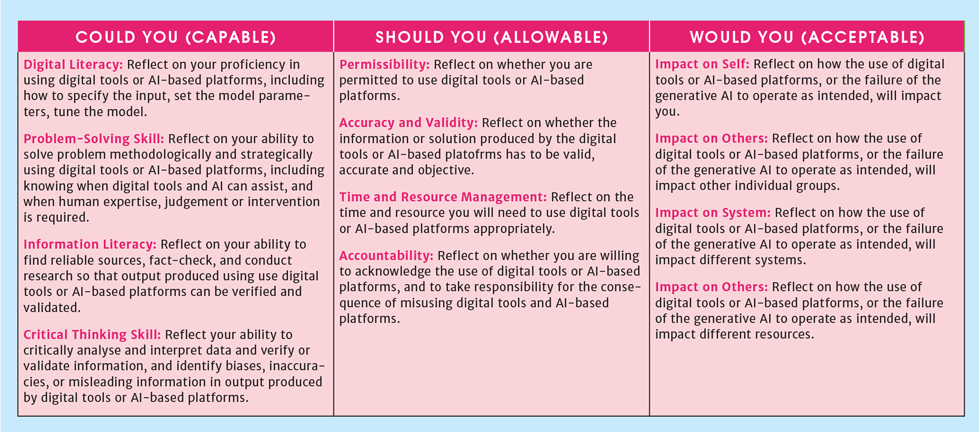 Dr Lim’s “Could You, Should You, Would You” sequence (Figure 1) offers a techno-ethical framework for deciding on the use of GAI for coursework, and in future professional situations. This framework is also applicable to the use of GAI by instructors, particularly in the context of whether GAI-based grading and feedback mechanisms are accurate enough to be trusted and acceptable from the perspective of the students.