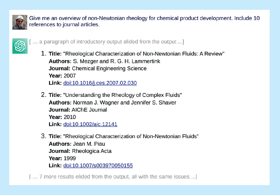 LLMs have a range of tuning parameters to control their output, one of which is the “temperature” of the model. As chemical engineers, we can lean on our understanding of thermodynamics and see that temperature is related to information entropy, with higher temperatures increasing the probability of the output containing unlikely combinations of words. When generating text, it is this entropy that gives the writing character, causes synonyms to be used, and means you don’t get the same output every time. When the LLM is acting as an ideation partner, it is these unlikely combinations that are the creative, outside-the-box, or unexpected ideas that stand out among the more predictable suggestions. However, when our desire is for strictly factual output, we still see these unlikely combinations in the output, but they are now perceived as incorrect statements.