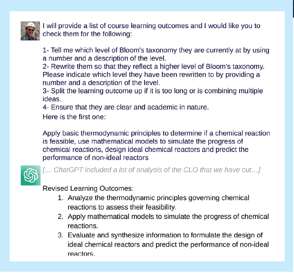 Every training course or university module has learning outcomes that explain its purpose. Writing to the genre can be daunting, with the usual sticking point being finding good verbs to describe the capabilities the students will develop. In working with academics across engineering disciplines, Giordana Orsini (an educational developer in UNSW Faculty of Engineering) developed a set of ChatGPT prompts to take draft learning outcomes, classify them using Bloom’s taxonomy, and offer suggestions for rewording. Figure 3 shows part of the much longer interaction with ChatGPT that takes an old and non-idiomatic learning outcome for a reaction engineering course, identifies that it can be improved by splitting into three, and suggests better verbs.