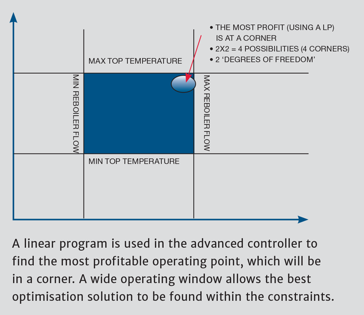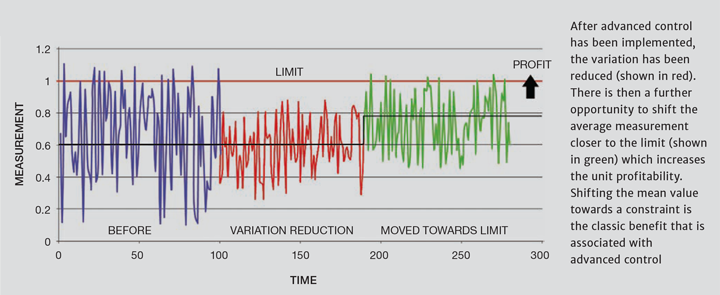 Multivariable control has the advantage that it is very flexible and can control a process from small to large and optimise it at the same time. The benefits of advanced control are well accepted by most process industries today. By controlling key variables, and reducing their standard deviation, you can shift the mean of key variables towards their constraint, pushing the unit and ‘riding’ the (changing) constraints for the optimum operation. A computer can perform this every minute, 24 hours a day, outperforming even the best process operator.
