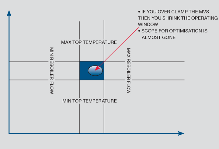 Figure 3 shows that shrinking the operating window by putting in tight limits on the manipulated variables (MVs) reduces the scope for optimisation.