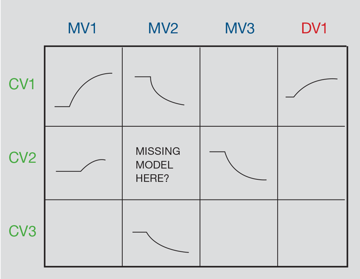 In Figure 5, the multivariable controller’s performance is very much dependent on the quality of the models. The actual measured value needs to coincide reasonably well with the prediction. If there is a large difference in the magnitude of the changes (gain) or in the dynamics (deadtime and lag) then the performance of the controller may be reduced.