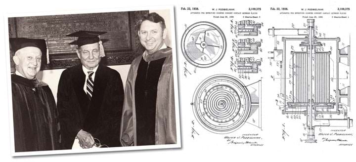 The other problem was the liquid-liquid extraction. Scaling up Heatley’s equipment would increase the residence time, giving excess hydrolysis. Rettew first used a mixer and a centrifugal separator sold for separating cream from milk. Variations on this were adopted by other companies. However, he eventually hit upon a centrifugal contactor which did both jobs, invented in 1934 by the son of Polish immigrants to the US, Walter Podbielniak (1899–1978), known as Dr Pod. The Podbielniak Contactor was an early and outstanding example of process intensification, giving high throughput in a very short time, and was adopted by Pfizer and others. The Mushroom Man was commemorated with a national heritage landmark. Dr Pod’s company did very well, and production of penicillin boomed. He was annoyed after the war when the US prohibited the export of his contactors to Poland for their penicillin plant.