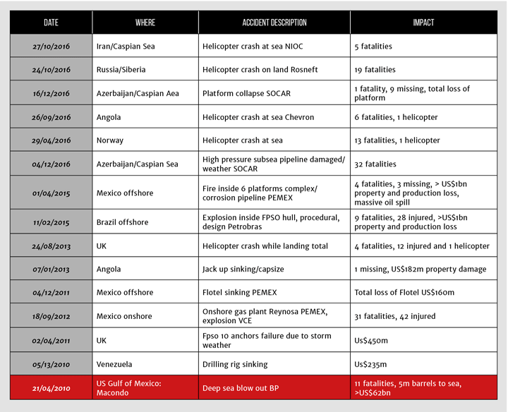 As you can see, major risk is not only about fire and explosion. Since Macondo there have been five helicopter crashes, killing 47 people. There have been five anchor failures, platform collapses or sinkings that have killed 11 people and cost at least US$2bn. And there have been four fires or explosions that have killed 79 people and cost at least US$2bn.