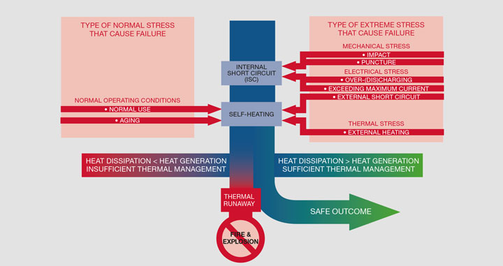 If a battery fails, the root cause can be any of a number of factors, ultimately leading to battery over-heating. Figure 2 illustrates the initial causes of a battery fire or explosion. Stresses from both normal and abnormal use will cause the cell to generate unwanted heat. If thermal management strategies and devices are implemented, this heat may be safely dissipated; however, when damage is so significant, or the thermal management system is insufficient, thermal runaway is a common outcome leading to fire or explosion. There are many options when it comes to providing adequate thermal management for battery packs, ranging from simply providing air vents in casework, spacing, or arranging cells in a pack in a new configuration, through to active cooling from air ventilation of liquid cooling loops.