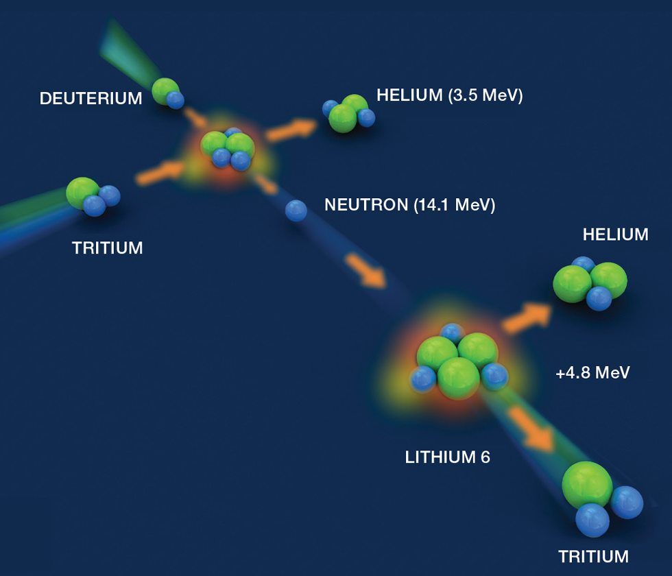 Deuterium is naturally abundant in seawater and is non-radiological, whereas tritium is a weak beta emitter with a half-life of 12.3 years. Because tritium is not available naturally, fusion energy powerplants must produce it (“breed”) using a “breeder blanket”, which generally contains lithium.