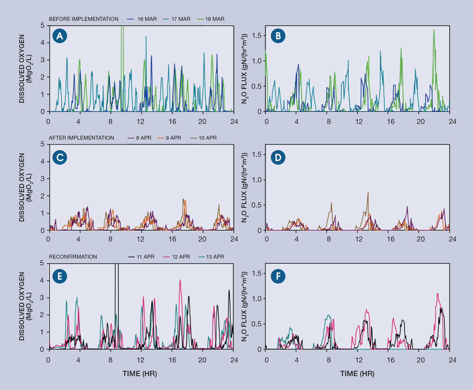 In another full-scale mitigation case study, a 35% nitrous oxide reduction was achieved at South Australia’s Bolivar WRRF after a low dissolved oxygen mitigation strategy was implemented. Figure 6 provides data from the dissolved oxygen concentration and emitted nitrous oxide flux before and after the implementation of the strategy. During a reconfirmation period, the mitigation strategy was switched off and dissolved oxygen levels (see Figure 6E) reverted to back to the levels in Figure 6A. Higher nitrous oxide emissions seen in 6A were again observed (6F) versus those during mitigation (see Figure 6D).