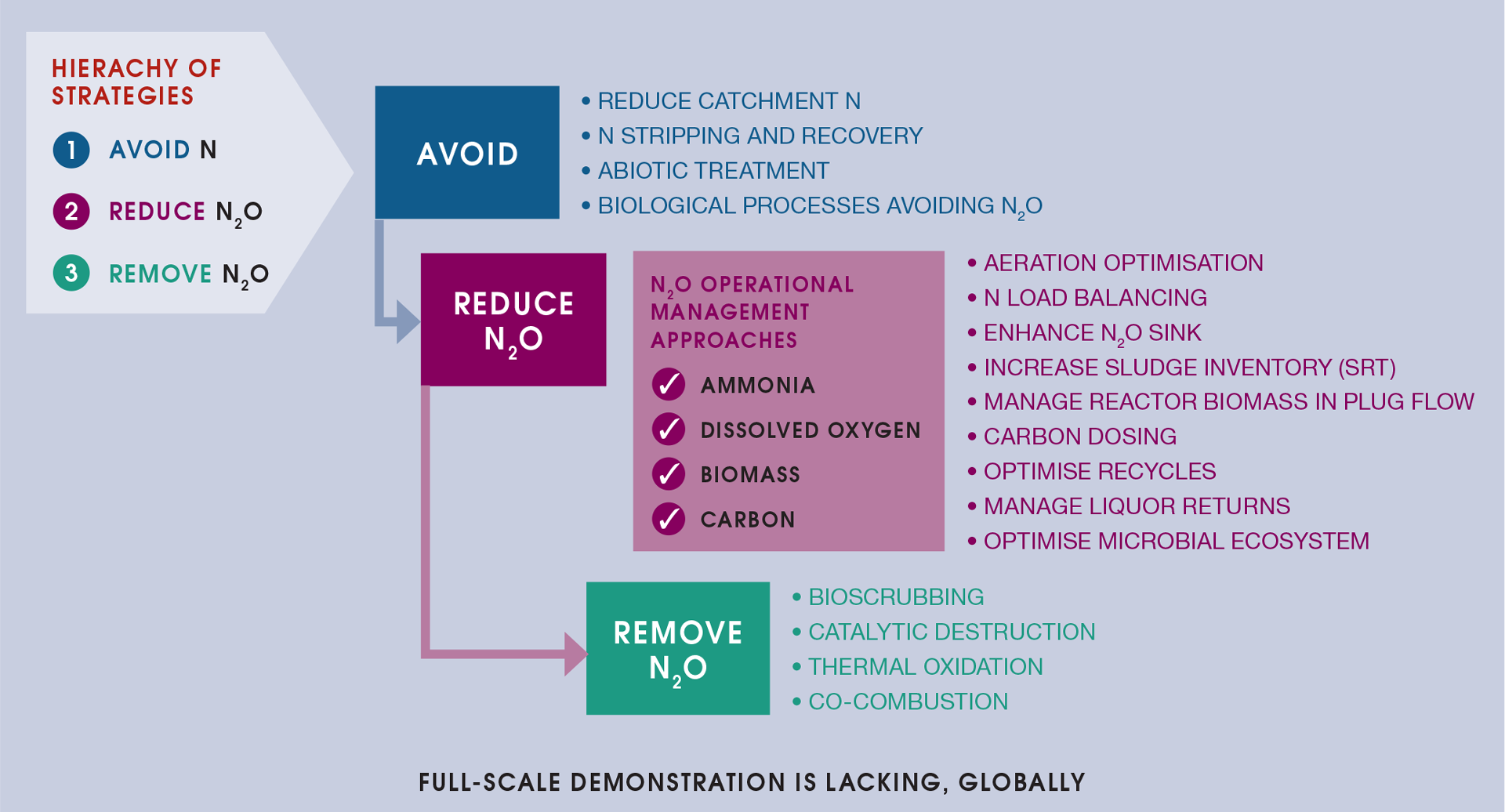 Many full-scale mitigation strategies have been proposed but not demonstrated at scale and/or in a sustained manner. Those which offer promise include advanced control systems with or without machine learning and artificial intelligence, optimisation of process setpoints to increase or reduce dissolved oxygen levels and balancing of loads and liquors to reduce ammonia loading (including for example step-feed arrangements). Carbon dosing has been demonstrated to reduce nitrous oxide emissions.