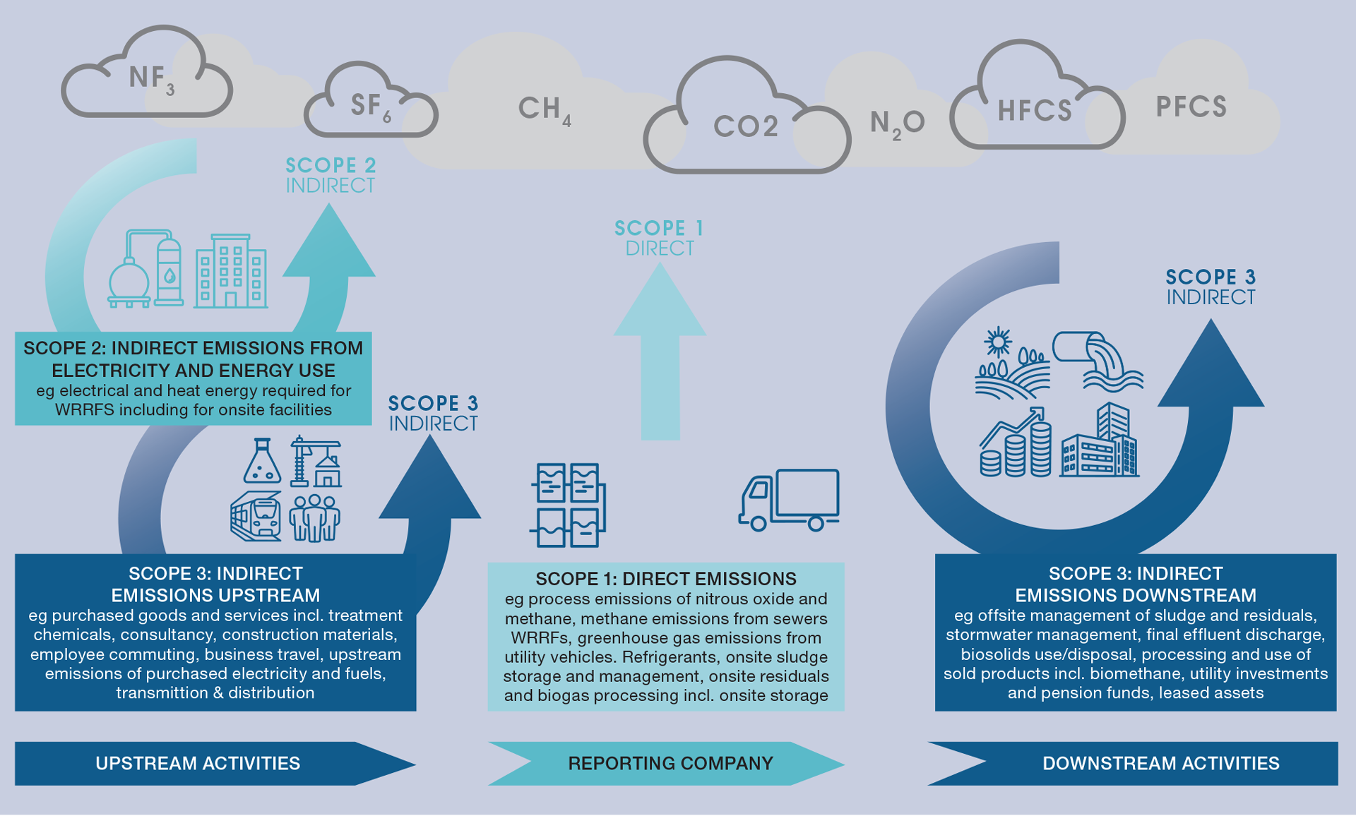 Along with methane (CH4) emissions, these greenhouse gases are termed process emissions (also known as direct Scope 1 process or fugitive emissions), which are directly emitted from wastewater treatment processes in industrial and municipal WRRFs. Both gases have immediate negative impacts beyond planetary heating – methane contributes to localised air pollution and nitrous oxide also destroys ozone. As the sectors that produce the power, concrete, steel, and chemicals used in wastewater treatment plants decarbonise their operations, the wastewater sector’s own direct process emissions will come to dominate the industry’s emissions.