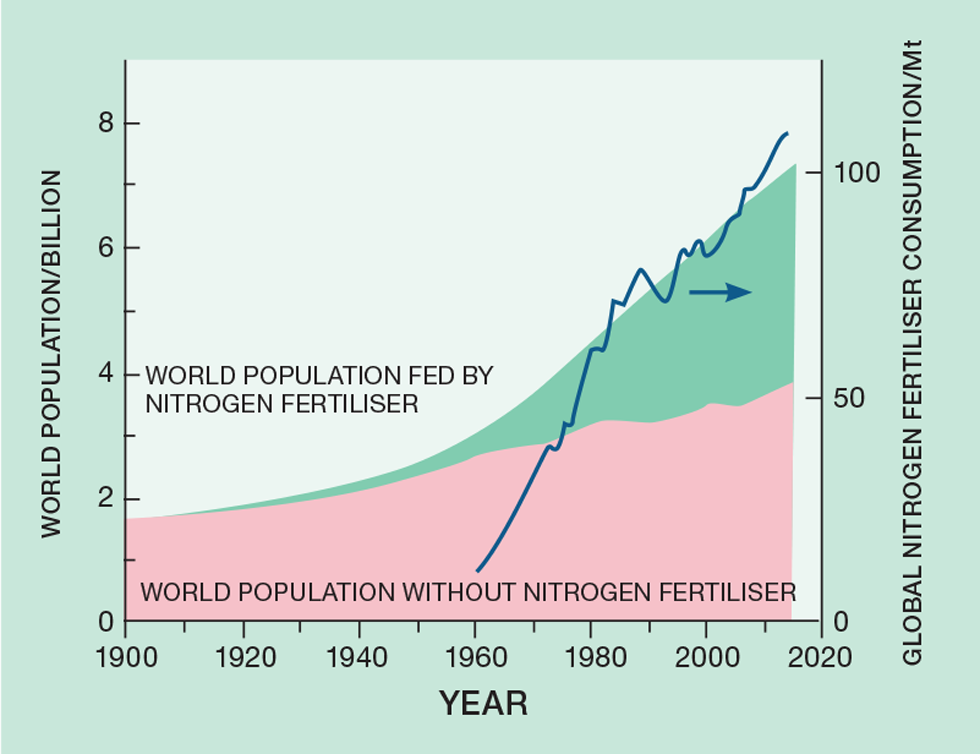 Crops require nitrogen to grow. There are four main sources – natural atmospheric deposition, biological nitrogen fixation, manure, and synthetic nitrogen fertilisers. The first two are insufficient on their own to generate enough nitrogen for the current global crop demand. This means we must use manure and/or synthetic nitrogen fertilisers to fill the gap. Current data shows that around half of the food that the world’s population is dependent on is reliant on using fertilisers (natural or synthetic). However, their production and use bring associated environmental concerns – soil acidification, water sources polluted with fertiliser run-off (eutrophication), energy use, and GHG emissions.