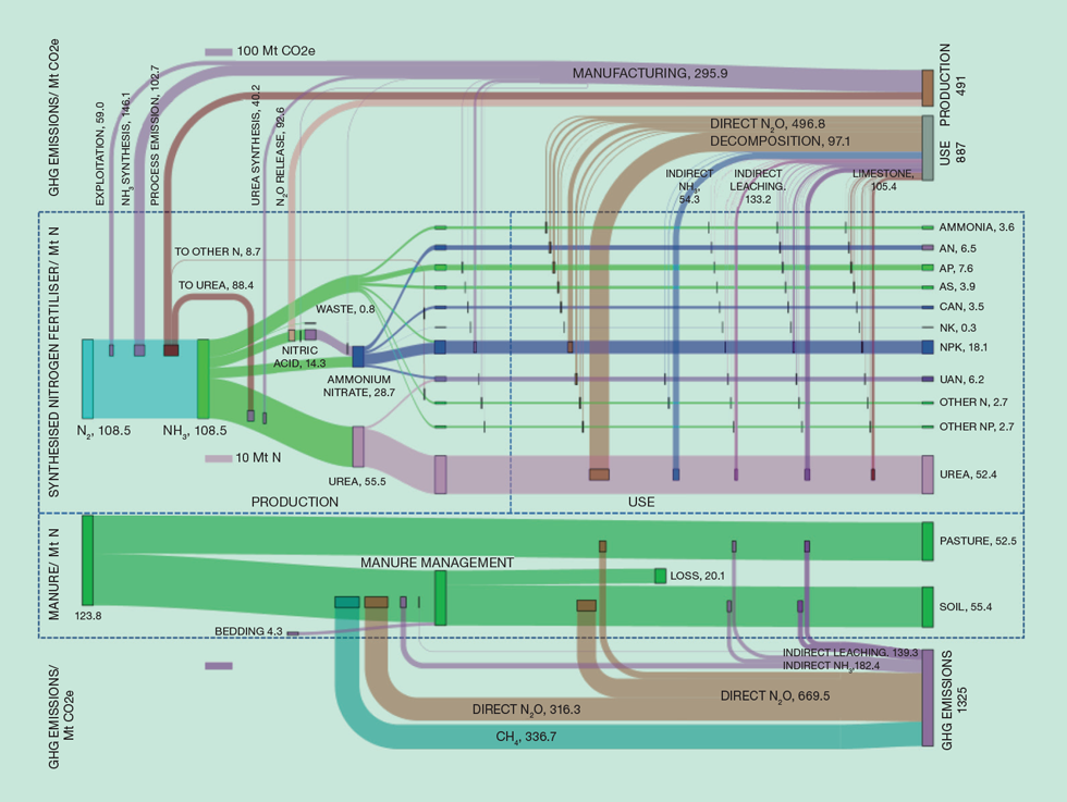 Around 55m t of nitrogen from manure is applied to crops every year, generating some 1.27 Gt CO2e – similar levels to synthetic sources. This means that per unit of nitrogen, manure emits 1.9 times more GHG than synthetic equivalents – predominantly due to additional emissions from manure storage and mobilisation. Unless these manure management emissions can be significantly reduced then manure will remain a higher emitter of GHG than synthetic fertilisers on an equivalent basis.