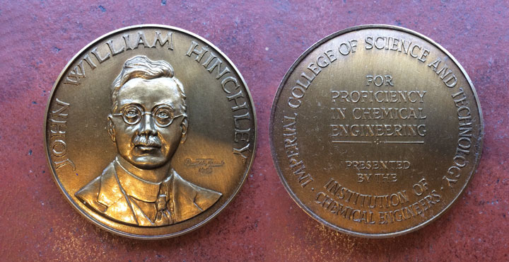 In 1932 the first Hinchley memorial lecture was held, and in 1942 IChemE established a Hinchley Medal, which continues today for the top final-year student at Imperial College. Stephen Richardson, IChemE President 2019–21 was the recipient in 1972. (Since 2007 it is awarded directly by Imperial.)