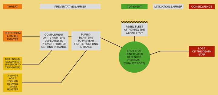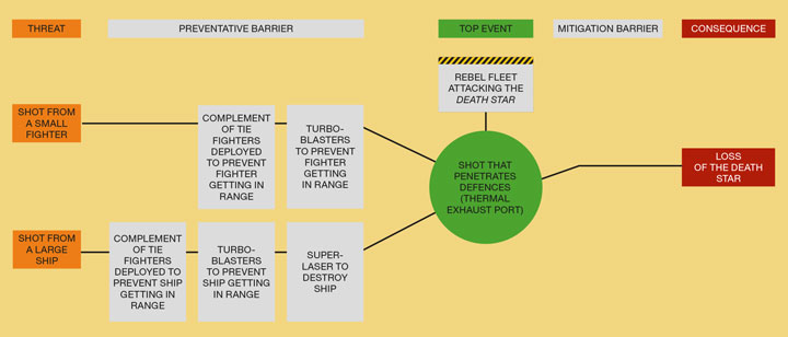 Considering the same scenario through a bow-tie diagram allows us to look at the barriers in sequence and break the hazard down further into specific threats (see Figure 1). We immediately see that not all the barriers previously identified are specific to each threat. For example, the Superlaser won’t destroy small, agile fighters. It’s also clear that none of them mitigate the consequences of a direct hit.