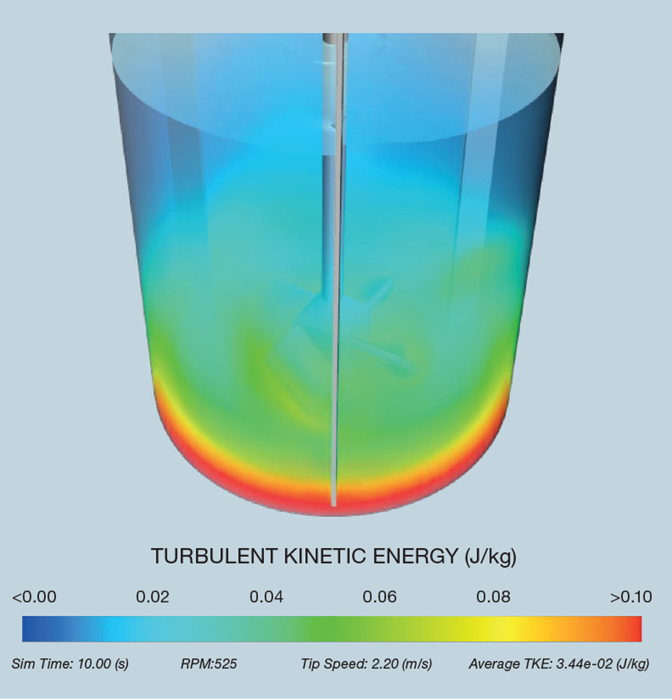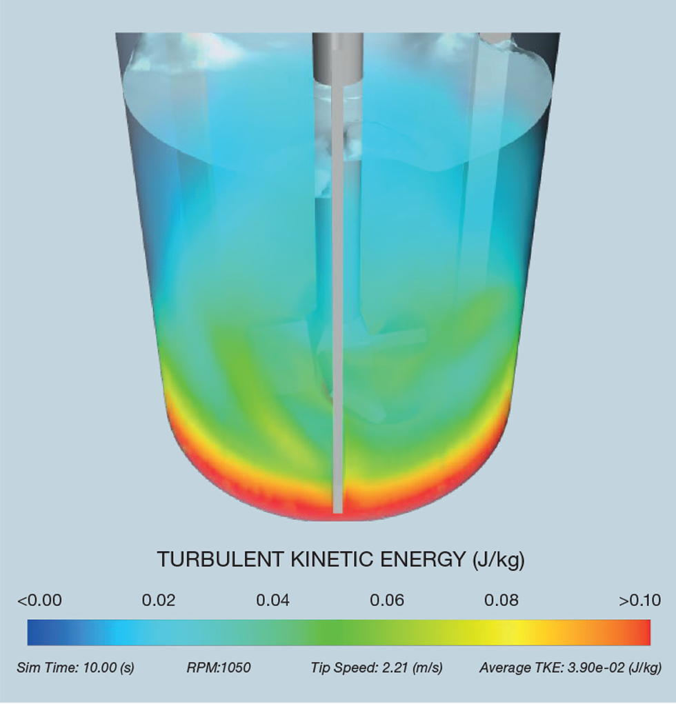 Increasing the tip speed may not be a viable option to increase the energy in the system in some cases, as it could lead to shear effects that affect product quality or yield. If that’s the case, a redesign of the agitator by changing impeller type, number or spacing may be necessary to achieve the required performance at scale, all of which can also of course be explored using modelling.
