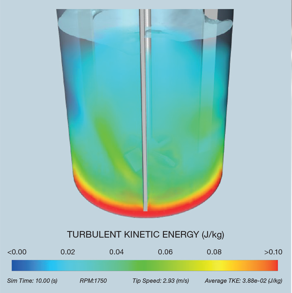 In the STR example I used the standard rule of thumb of matching impeller tip speed between scales in simulations of two STRs of 500 mL and 5 L volumes. In figures 1 and 2 you can see that in the geometrically similar models, the turbulent kinetic energy (TKE) profiles in the fluid appear relatively well matched between the scales at the same tip speed, with high levels near the agitator blades and lower values at the liquid surface.