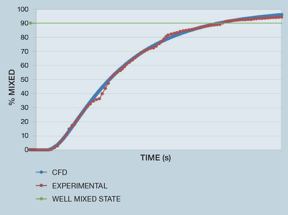 Figures 4 and 5 above show that CFD simulations can predict mixing times with good agreement to experimental data across scales. Once developed, these prediction models can be used to design in silico experiments to optimise operating parameters across scales, providing insights into the differences between equipment currently owned as well as for scaleup equipment design.