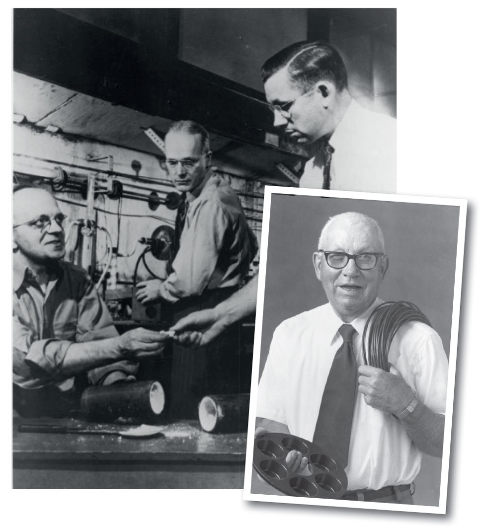 Image citation: Roy Plunkett with Teflon insulated cable (AVD_2004268_P00000217) and Roy Plunkett reenacts invention of Teflon, 1966 (AVD_2004268_P00000214) both DuPont Company External Affairs Department photograph files (Accession 2004.268), courtesy of the Audiovisual Collections and Digital Initiatives Department, Hagley Museum and Library, Wilmington, DE 19807