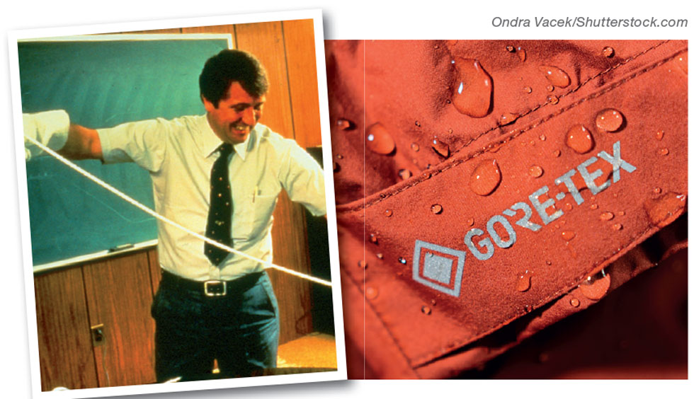 In 1957, one of DuPont’s chemical engineers, Wilbert “Bill” Gore (1912–1986), left the company to set up a business with his wife Genevieve making ribbon cables for computers insulated with PTFE. In 1969 his son Robert Gore (1937–2020), who was also a chemical engineer, was working to find the ideal conditions of heat and tension for stretching rods of PTFE in processing. In frustration he yanked it hard by hand, and it stretched about eight times. It also opened up, becoming porous. Instead of regarding this as a failure, the father and son’s inventive minds looked for applications as they developed the practical production process. The material was given the trademark Gore-Tex. The most famous application is its use as a waterproof membrane in clothing which still allows the passage of water vapour so does not become sweaty.