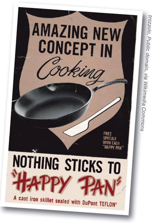 US inventor Marion A Trozzolo (1925–1992) had a company making plastic-coated laboratory ware, including what is now the ubiquitous PTFE-coated magnetic stirrer. He had heard of the growing interest in imported Tefal pans and produced his own coating method for cast iron, heavily advertising it in 1961 as the “Happy Pan”. It was at this time the urban myth began that PTFE had been invented by NASA as an offshoot of the Space Race (you might say the non-stick pan came indirectly from the French equivalent, and NASA certainly used PTFE extensively in space suits and fluid systems). Many US companies began making coated cookware of variable quality, so demand increased production and reduced the price of PTFE.