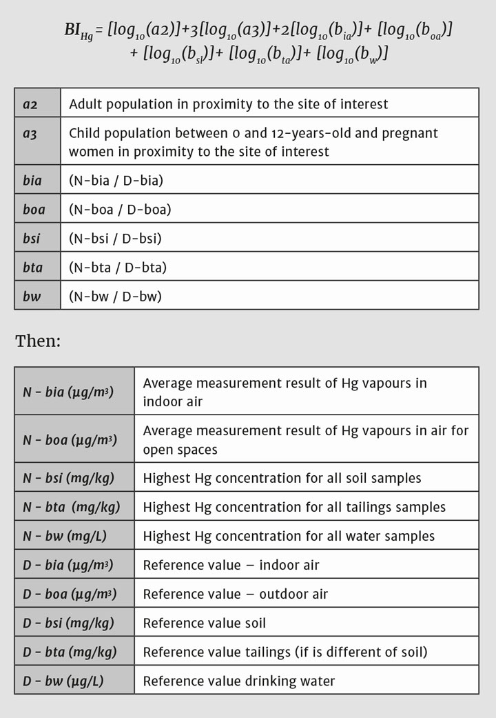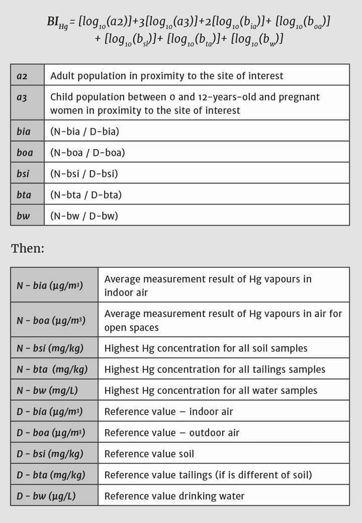 The BIHg analyses soil, air, and water over a target area (maximum 200–300 m in all directions), comparing each measurement to its reference value. It also considers other factors, like population demographics, the number of pregnant women and children under 12 exposed, and whether the mercury amalgam was burned indoors (the formula can be found along with Table 1: Variables of the Mercury Contamination Index).