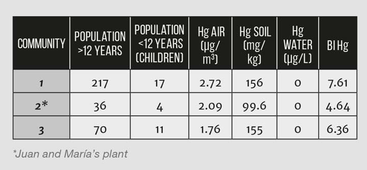 We found contamination in Juan and María’s plant, but the BIHg value of 4.64 was lower than two other nearby communities we investigated in the area (see Table 2). This is not to say that Juan and María’s family are out of risk. Only that for the moment, the other two communities should take priority for further investigation and cleanup.