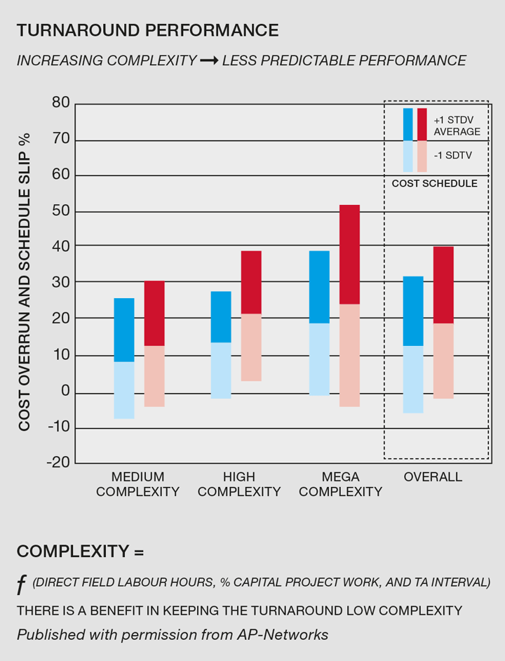 It has been known for some time that the size and complexity of a turnaround tends to correlate with the likelihood of being able to achieve a predictable cost and schedule. Larger turnarounds, with more scope and consequently more field labour hours tend to be less easy to keep within cost and schedule targets than smaller, simpler turnarounds. The turnaround consultancy, Asset Performance Networks LLC (for which I previously worked) even goes so far as to publish comparisons of average cost and schedule overrun for low, medium, high and mega-complexity turnarounds at its annual conference every year (https://bit.ly/3qQipAt). It assesses turnaround complexity as a function of (a) scope size, in terms of direct field labour hours, (b) the proportion of the scope that is related to capital project work, and (c) the length of the interval between turnarounds on the asset (https://bit.ly/3rqO6R1). The latest publication from AP-Networks (2019) is shown in Figure 1 and clearly illustrates how the risk of overrun increases with increasing complexity.