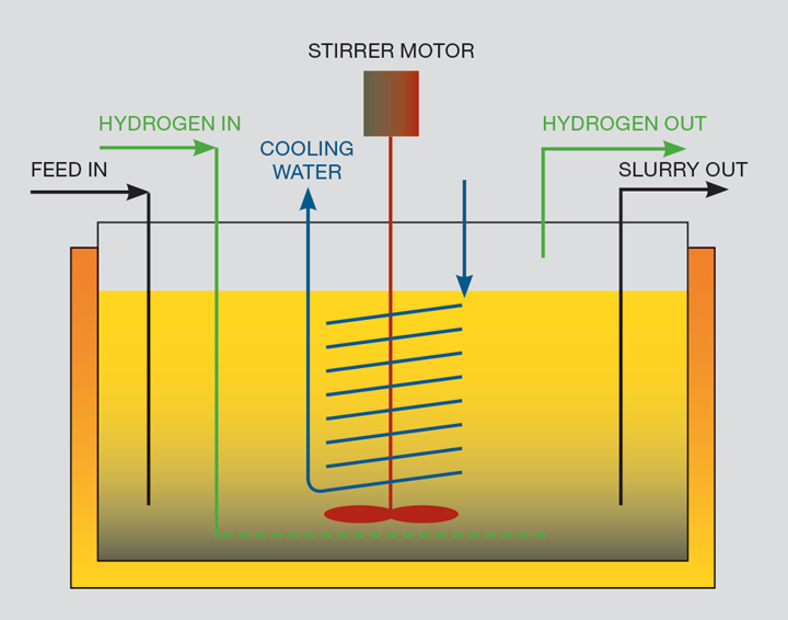 Hydrogenation of saturated oils and fats is a batch process which takes place in a heated tank (see Figure 2). The oil feed (eg sunflower seed or olive oil) is pumped into a heated pressure vessel and a vacuum is applied to inhibit oxidation as the heating is applied. The temperature is raised to 140-250°C and the mixture is stirred to ensure an even temperature. Nickel catalyst solids, mixed with a small amount of oil, are then pumped in, followed by hydrogen gas, which brings the pressure to 2.7–4 barg. The hydrogenation reaction is exothermic, so the external heating is removed and cooling applied, vigorous stirring ensuring the temperature remains in the 70-80°C range. After 40–60 minutes the hydrogenated oil mixture is pumped out as a slurry and the catalyst solids removed in filters. Cooling to room temperature allows the hydrogenated oil to solidify.