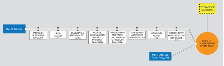 So for example, if “overfilling” is one of the most significant major hazard scenarios leading to loss of containment at a tank storage site then the control measures or barriers shown in Figure 2 are usually present.
