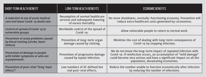 VACCINES are a wonderful invention that have transformed the health of billions. Not only can an individual be protected by a vaccine but, once enough people have been vaccinated, the whole population is protected because the infection cannot spread in a sustainable way (herd immunity). If a good vaccine that can generate an immunity to the virus causing Covid-19 is developed, there will be huge benefits (see Table 1).