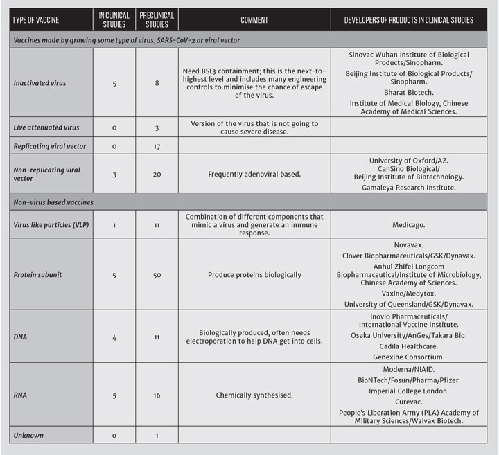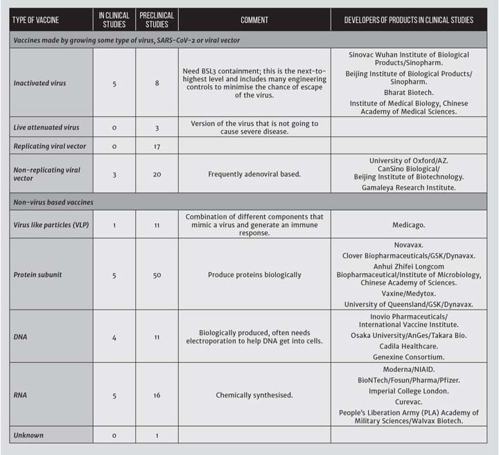 There are at least 160 candidates in development (summarised in Table 2). Many of the vaccine approaches being used have never produced a marketed vaccine.