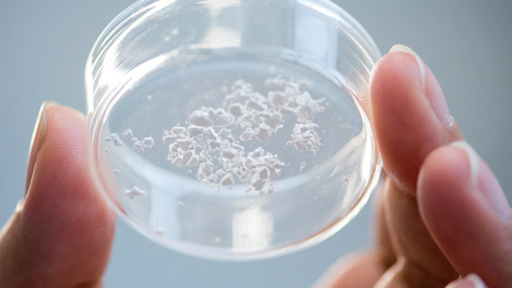 Once the protein and silica precursor are mixed, silica nanoparticles rapidly grow around proteins, and within seconds a cloudy suspension appears – this indicates that the nanoparticles are large enough to scatter light, and they start to precipitate. Once nanoparticles have precipitated, we can collect them. At this stage, a silica network covers individual proteins and protects them from unfolding. This powder can be stored without fridges for many months.