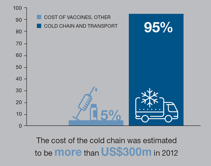 Because of problems with electricity and equipment, many vaccines are wasted. WHO estimates that anywhere between 30-50% of vaccines are discarded today because of cold-chain failures. It is also possible that some people in developing countries are receiving inactive vaccines because of cold-chain failures. The cold chain as a solution for vaccine storage and delivery was introduced by WHO in the 1970s, and it has remained unchanged for almost 50 years. Efficient alternatives to refrigeration would help us to make vaccines widely available. Even incremental improvements in vaccine coverage can have a dramatic effect on public health, as once coverage exceeds about 85%, “herd immunity” provides protection to unvaccinated individuals.