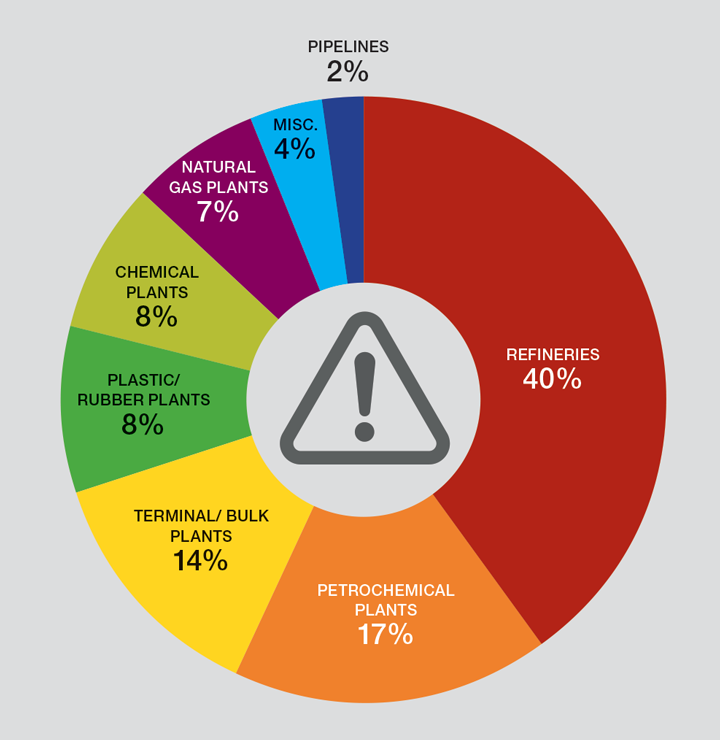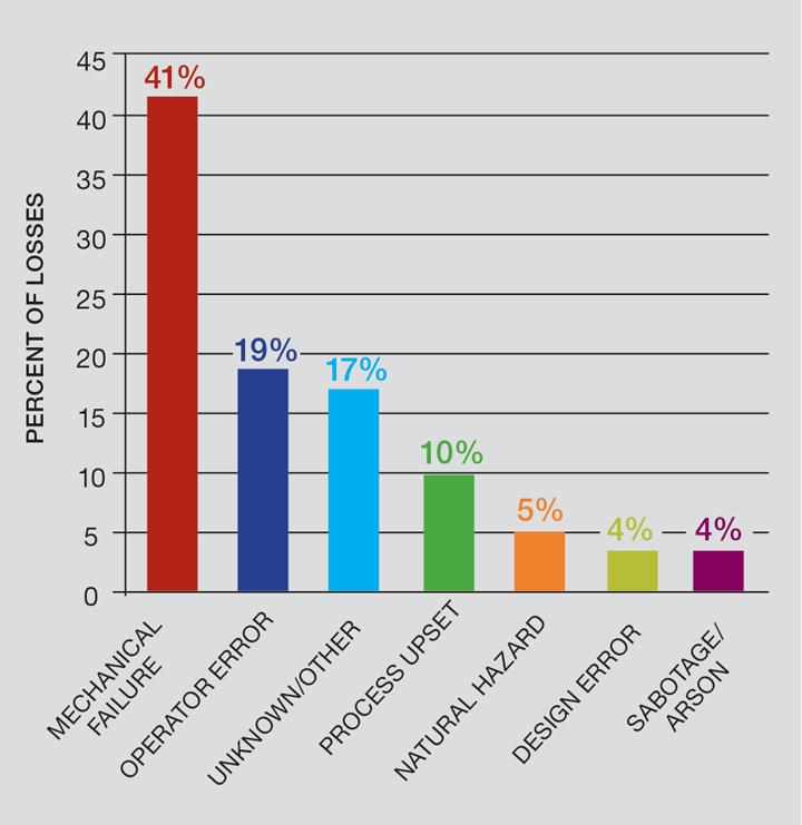 Figures 1 and 2 provide a summary of industrial accidents over the last 30 years and indicate that refineries have the highest percentage of losses while mechanical failure and piping system breakdown are the greatest cause of these accidents.