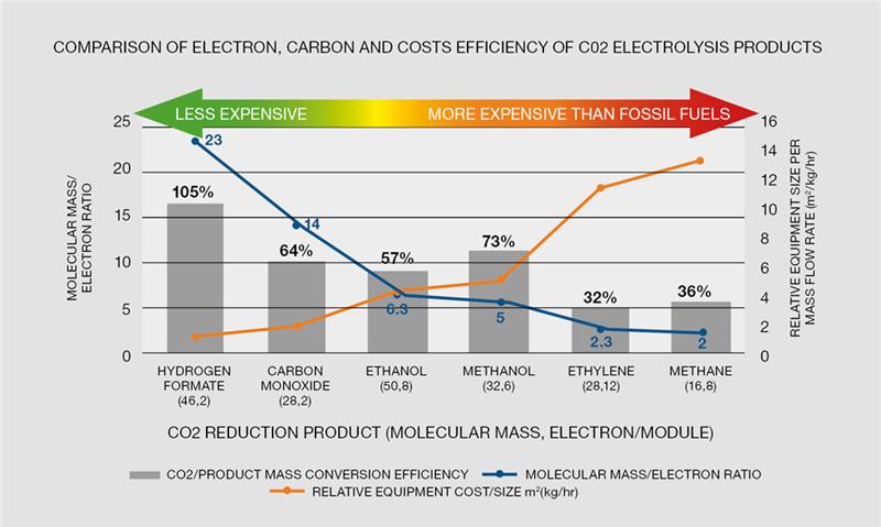 As you can see in the Figure 1, formic acid (23) and carbon monoxide (14) have the highest molecular M:E ratio of any CO2-derived product and therefore enable the largest mass of product to be made with the least energy input at the lowest equipment cost. These two e-molecules provide the best opportunity today to displace their fossil-based alternatives and provide carbon-rich but sustainable and low carbon emission derivative products and should be the focus of entrepreneurial and industrial effort.