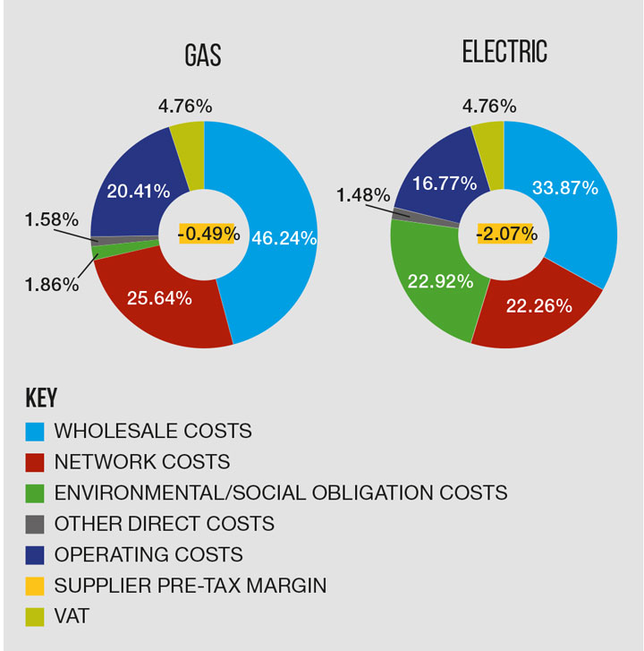 It is notable that electricity presently carries a much higher environmental and social obligation cost than gas. Ofgem data3 is shown in Figure 2. When the UK’s electricity supply has an increasing percentage of renewables, the justification for a 23% environment and social levy compared to 2% for gas is bewildering.