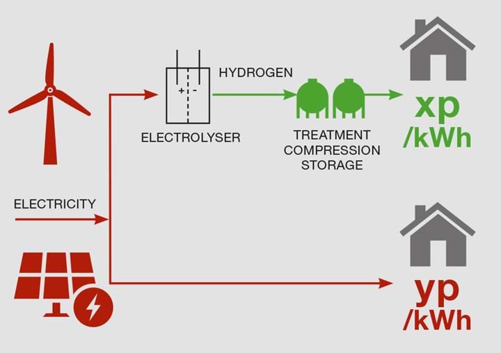 Let’s now move forward a decade or so when many commentators are predicting the use of green hydrogen for heating. Here hydrogen is produced by the electrolysis of water using renewable electricity.