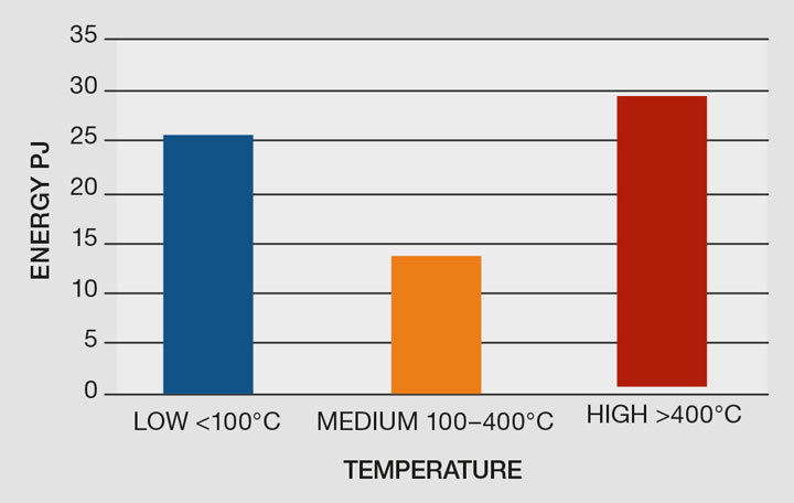 The EU Joint Research Centre’s Heating and Cooling Demand and Market Perspective Report4 provides Figure 4 for the UK. Percentages for low, medium and high temperature heat are 38, 21 and 41%. Hence no temperature range dominates heat demand.