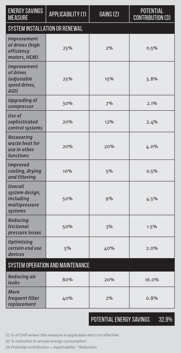 Coupled with this significant overhead, poor practices and housekeeping can also contribute to unnecessary wastage. According to a report entitled Compressed Air Systems in the European Union, when looking at the most important energy-saving techniques available to compressed air users, the energy savings amount to 32.9%, achievable over a 15-year period.