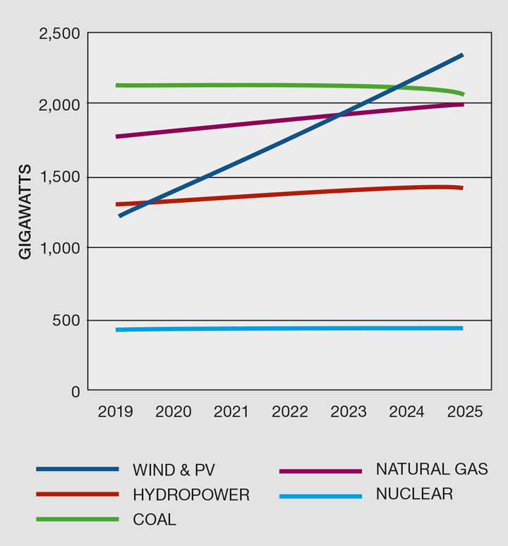 The International Energy Agency (IEA) reports that solar, wind and hydropower projects are rolling out at their fastest rate for four years. Its latest report3 predicts that by 2024 a new dawn for cheap solar power could see the world’s solar capacity grow by 600 GW, almost double the installed total electricity capacity of Japan. Overall, renewable electricity is expected to grow from 1,226 GW in 2019 by 1,200 GW in the next five years, the equivalent of the total electricity capacity of the US.