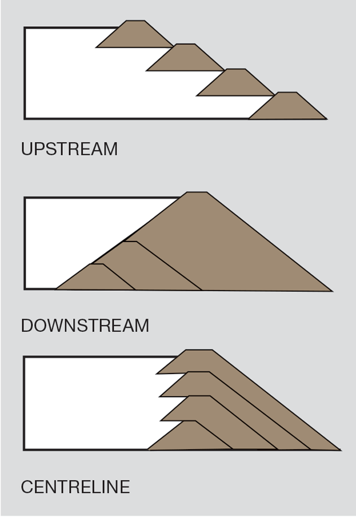 In the upstream method the face of the dam is not built in a single phase as with a hydroelectric dam, instead the face is built up in stages as the tailings are added and their depth increases. The face of the dam is built from the coarser portion of the tailings themselves and is built over the finer slurries it is designed to hold back. Centreline and downstream dams also use tailings material but are considered safer. Downstream dams are considered the safest.