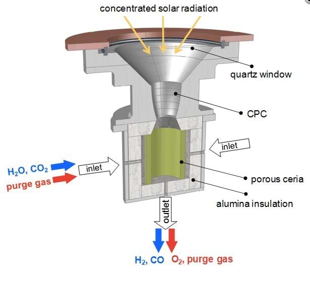 The ETH team say that the key component in the two-step H2O and CO2 splitting process is a reticulated porous ceramic (RPC) structure in the reactor. It is made of a material called ceria (CeO2) which facilitates molecule splitting.