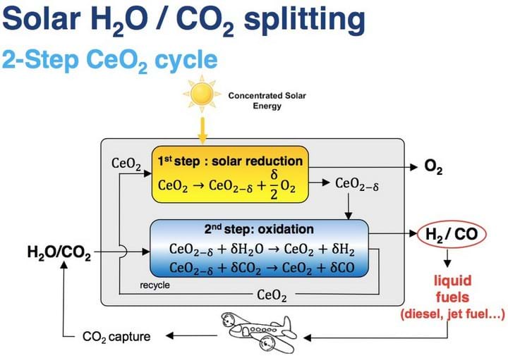 “Ceria is the state-of-the-art material,” said Philipp Furler, ETH researcher and leader of international solar chemistry research group SolarPACES Task II. “It has the ability to release a certain amount of its oxygen and then in the reduced state it has the capability of splitting water and CO2. In the first step, at 1,500°C, we release a fraction of the oxygen contained in the material, thereby a pure stream of oxygen leaves the reactor as a valuable by-product.”