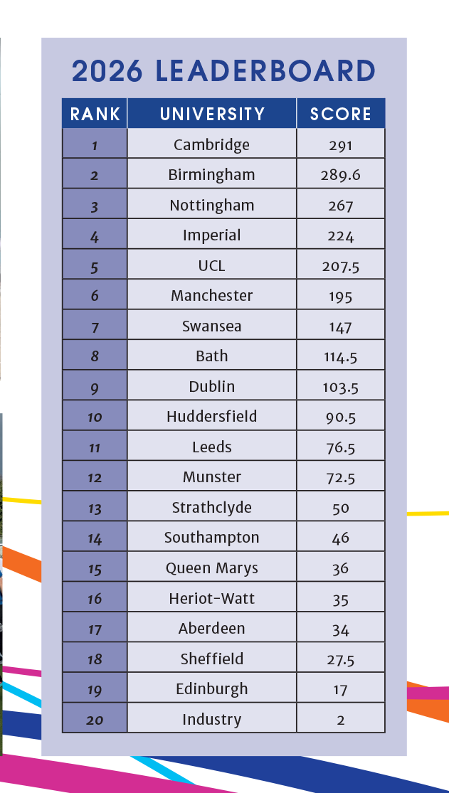 Hosting for the second successive year, organisers at the University of Nottingham adapted the scoring system so points were more evenly weighted between small and large universities. Returning after a four-year absence, Cambridge finished on 291 points, just one ahead of Birmingham, winners of 18 titles since 1985.