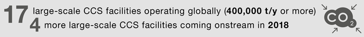 Two further projects entered advanced development in 2017. In the Norwegian full-chain CCS scheme, which will capture industrial emissions for storage under the North Sea, detailed studies have begun at three sites – Klemetsrud waste-to-energy plant, Norcem cement plant in Brevik, and at Yara’s Porsgrunn ammonia plant. The Louisiana Lake Charles methanol facility will produce syngas from petroleum coke.