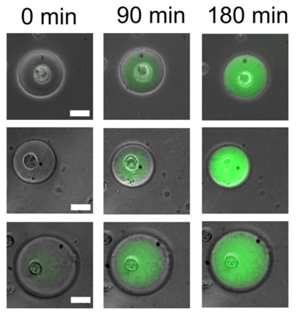 Using a reaction process that culminates in fluorescence allowed the researchers to see if the hybrid cell was functioning. Over three hours, the fluorescence increased significantly in the hybrid cells, whereas a control sample without a biological cell within the vesicle showed hardly any signs of fluorescence. The vesicles of the hybrid cells also remained intact a week later and still successfully held the encapsulated biological cell.