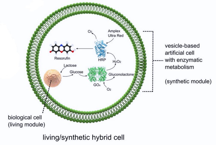 The hybrid cell was constructed so that the vesicle host creates a shell around the biological cell. The biological cell has an organelle-like function and can process chemical feedstocks inside the vesicle. The researchers demonstrated the ability of the hybrid cell through a reaction sequence of three steps: hydrolysis of the lactose feedstock by the biological cell produces galactose, the galactose product is oxidised to produce H2O2, and then oxidation of a fluorogenic molecule by H2O2 in the presence of an enzyme produces the fluorescent end product, resorufin.