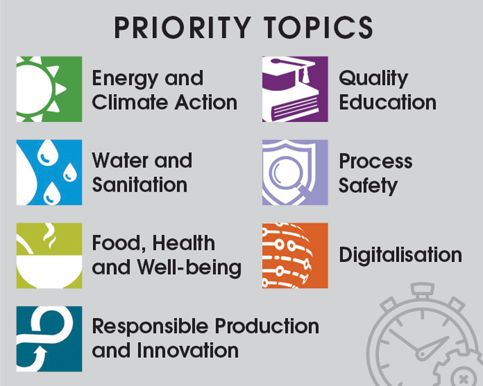 The seven Priority Topics are: Energy and Climate Action; Water and Sanitation; Food, Health and Well-being; Responsible Production, Innovation and Industry; Quality Education, including Lifelong Learning; Process Safety, including Major Hazards Management; and Digitalisation, including Cyber Security.