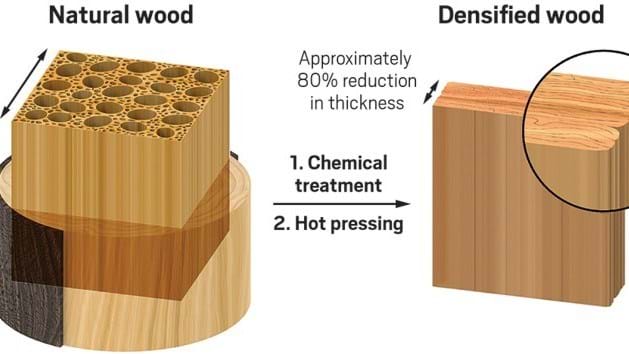 Using a new technique for densifying wood, researchers at the University of Maryland have been able to compress wood to 20% of its original thickness resulting in complete densification. The natural wood is first boiled in a solution of NaOH/Na2SO3 which makes it more porous and flexible. The wood is then compressed perpendicular to its growth direction at a temperature of 100°C.