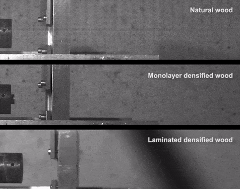 The strength of the densified wood was put to the test by firing a bullet-like projectile at it. The laminated densified wood stopped the projectile part way through, while the projectile went straight through the natural and monolayer densified wood.